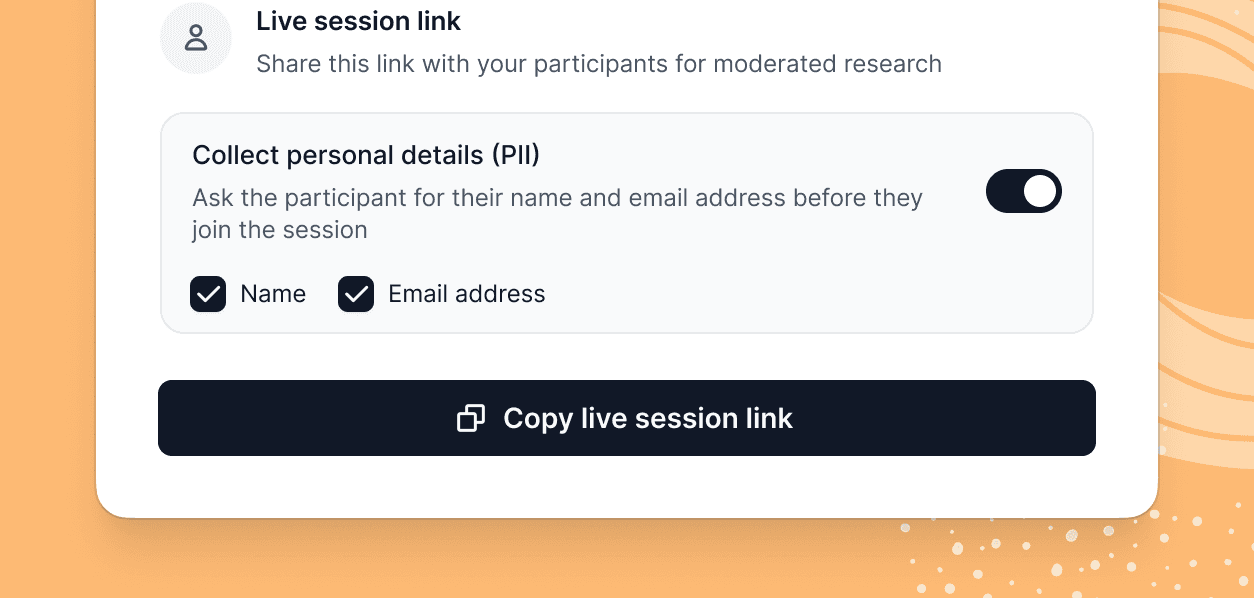 Simply enable Collect personal details (PII) in the live session share settings and choose which fields to request. The information is gathered before participants join, giving you clear attribution across notes, transcripts, and insights from the very beginning.